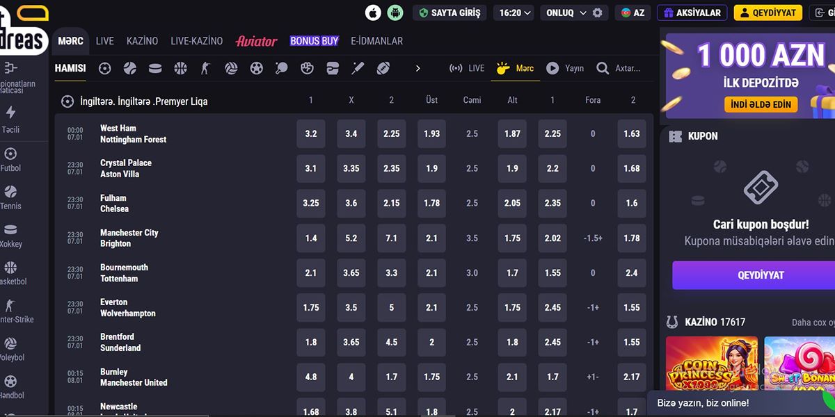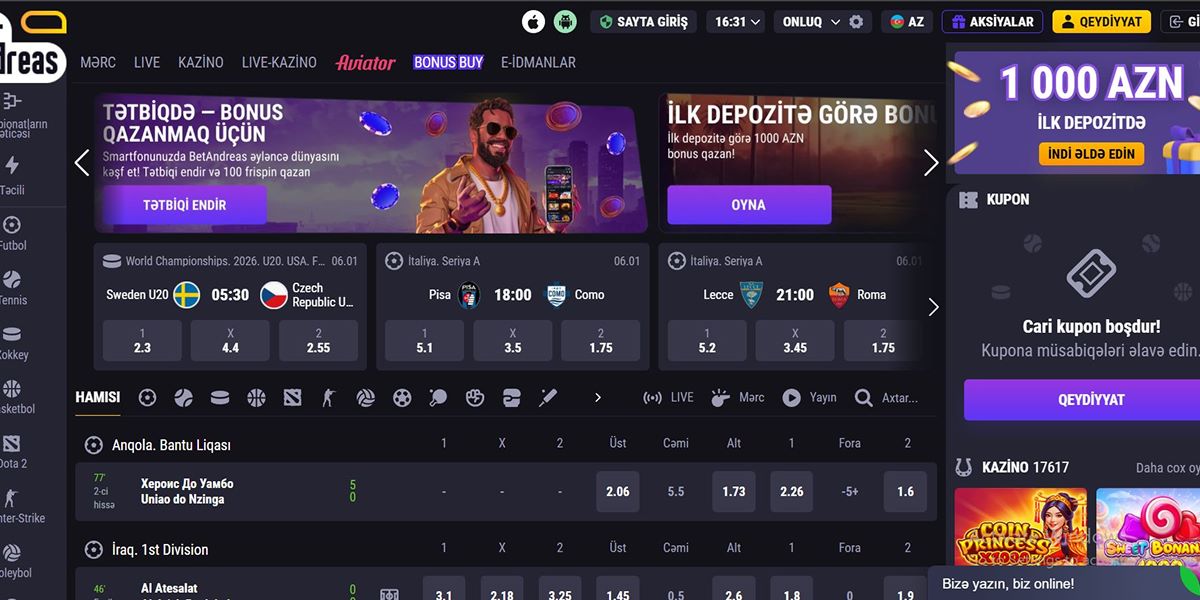 BetAndreas Kazino, Azərbaycanlı oyunçular arasında çevik AZN dəstəyi, aşağı giriş limitləri və geniş oyun çeşidi sayəsində tez bir zamanda populyarlıq qazanan müasir beynəlxalq qumar platformasıdır. 2022-ci ildə Bizbon N.V. tərəfindən qurulmuş və idarə olunan kazino, Kurasao və MGA Malta lisenziyalarına malikdir ki, bu da tənzimlənən oyun prosesi və oyunçunun müdafiəsini təmin edir. 3000-dən çox slot oyunu, güclü canlı kazino və inteqrasiya olunmuş idman kitabı ilə BetAndreas həm kazino üstünlüklü, həm də idmana yönəlmiş Azərbaycan istifadəçiləri üçün yaxşı xidmət göstərir. Əlavə olaraq, ₼2 minimum depozit, VPN-dostu giriş və sürətli dəstək ilə platforma özünü yerli bazar üçün praktik və əlçatan bir seçim kimi təqdim edir.