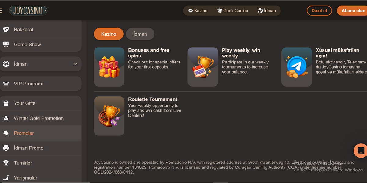 Promosyonlar Joy Kazino promo səhifələrində siyahıya alınıb və tez-tez yenilənir.